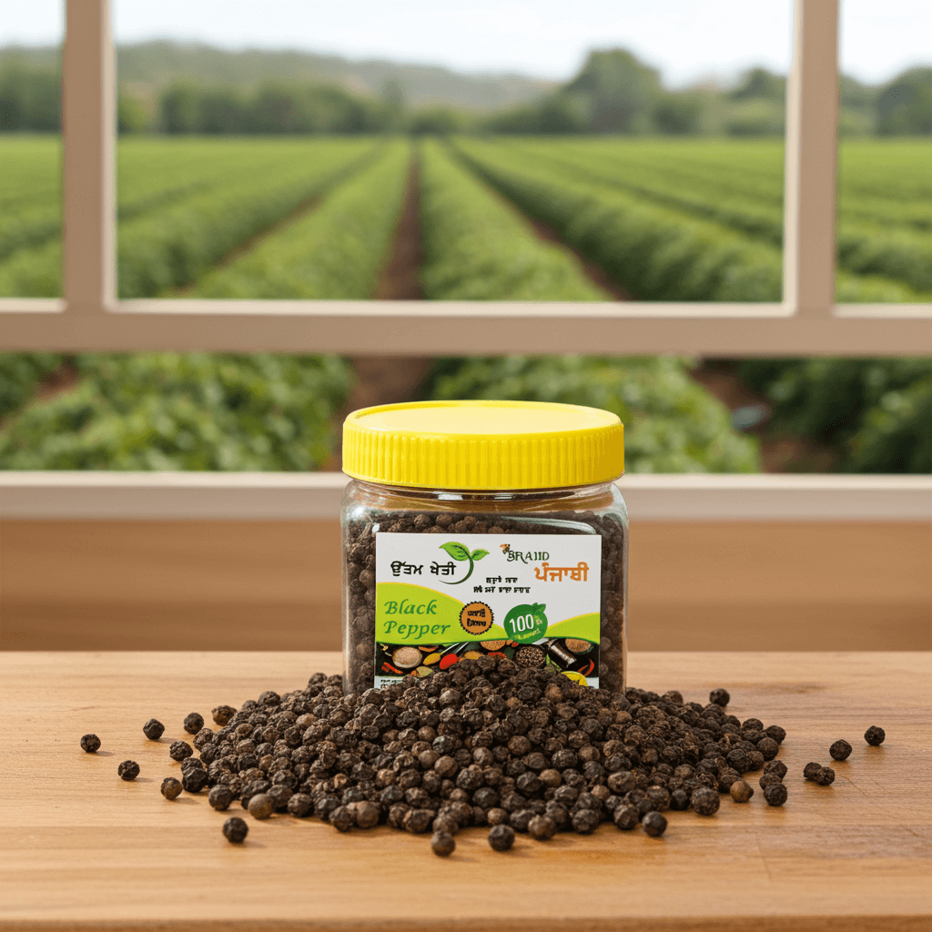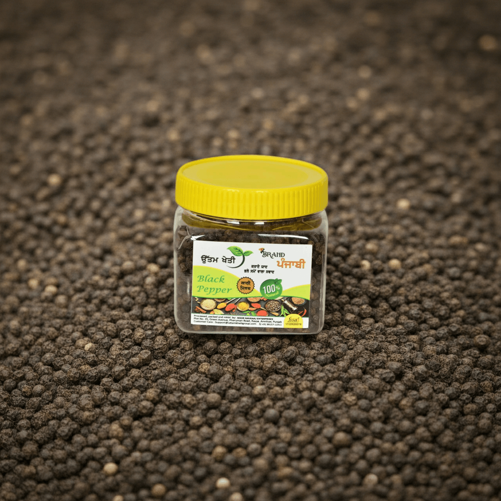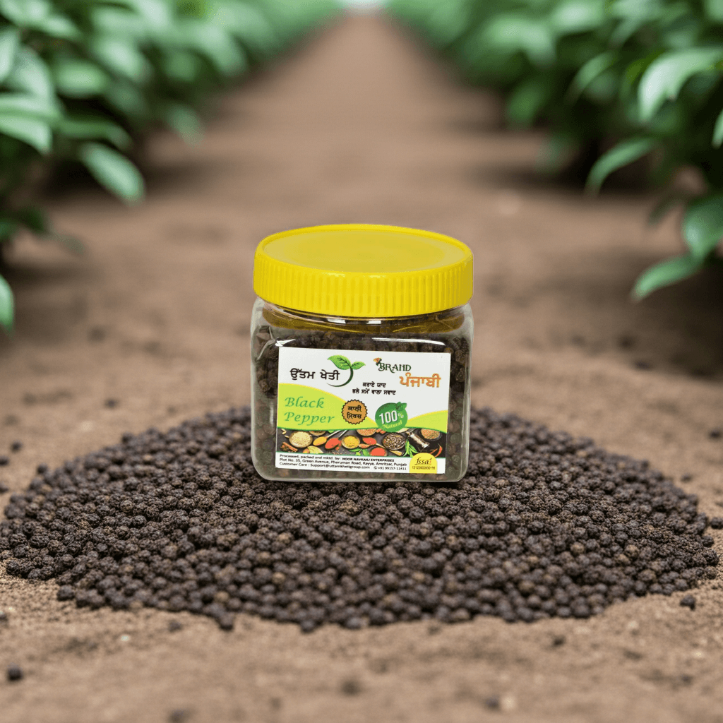 ਉੱਤਮ ਖੇਤੀ ਕਾਲੀ ਮਿਰਚ ਸਭ ਤੋਂ ਵਧੀਆ ਕੁਆਲਿਟੀ ਵਾਲੀ ਹੁੰਦੀ ਹੈ – ਹਰ ਦਾਣਾ ਧਿਆਨ ਨਾਲ ਚੁਣ ਕੇ ਪੈਕ ਕੀਤਾ ਜਾਂਦਾ ਹੈ। Whether you’re crafting homemade garam masala or preparing flavourful biryani, this kali mirch whole delivers the perfect sharp note every single time. The bold, wrinkled peppercorns release their full natural fragrance when added whole or lightly crushed – pure culinary enjoyment!