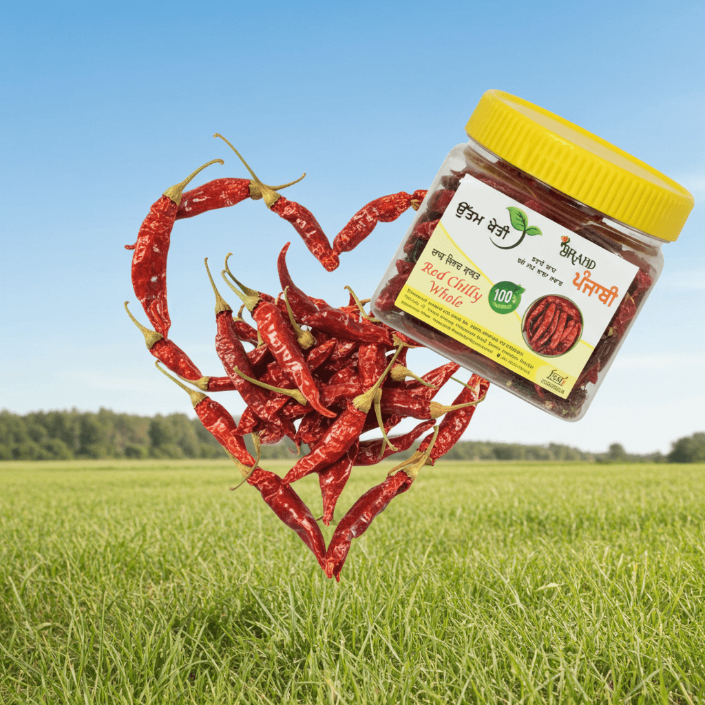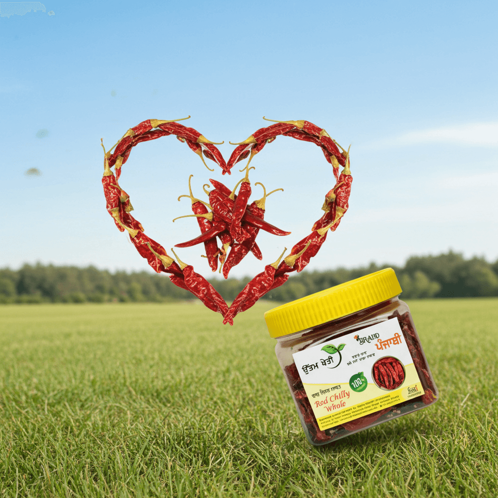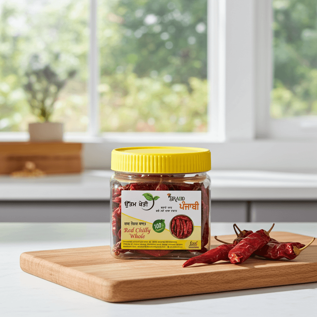 Red chilly whole 100% ਕੁਦਰਤੀ ਹੈ – ਹਲਕੀ ਤਿੱਖੀ। ਸਵਾਦ ਦਾ ਤੜਕਾ ਜੋ ਹਰ ਖਾਣੇ ਨੂੰ ਦਾਦੀ ਦੇ ਹੱਥਾਂ ਵਰਗਾ ਬਣਾਉਂਦਾ ਹੈ।