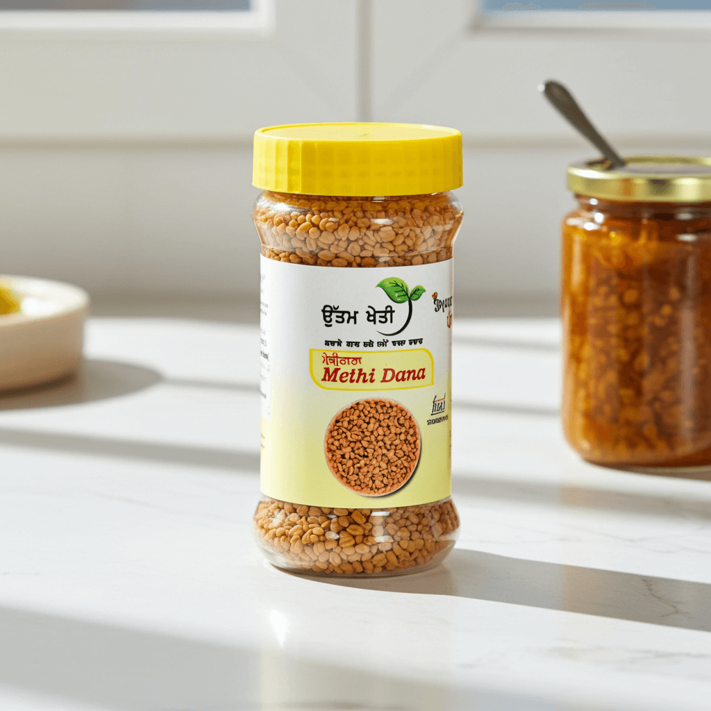 Organic Methi Dana – ਤੁਹਾਡੀ ਸਿਹਤ ਦਾ ਅਲਟੀਮੇਟ ਵਾਰੀਅਰ! 100% ਕੁਦਰਤੀ, ਕੋਈ ਰਸਾਇਣ ਨਹੀਂ, ਪੰਜਾਬ ਦੇ ਸੁਨਹਿਰੇ ਖੇਤਾਂ ਤੋਂ ਸਿੱਧਾ। ਮੇਥੀ ਦਾਣਾ ਵਾਲਾਂ ਨੂੰ ਰੈਵੋਲੂਸ਼ਨਰੀ ਗਰੋਥ ਦਿੰਦਾ ਹੈ, ਡਾਈਬਟੀਜ਼ ਨੂੰ ਕੰਟਰੋਲ ਕਰਦਾ ਹੈ ਤੇ ਵਜ਼ਨ ਨੂੰ ਮੈਲਟ ਕਰਦਾ ਹੈ। Fenugreek (ਮੇਥੀ) ਨੂੰ ਆਯੁਰਵੈਦ ਤੇ ਮਾਡਰਨ ਸਾਇੰਸ ਦੋਵੇਂ ਸੁਪਰਫੂਡ ਮੰਨਦੇ ਹਨ!